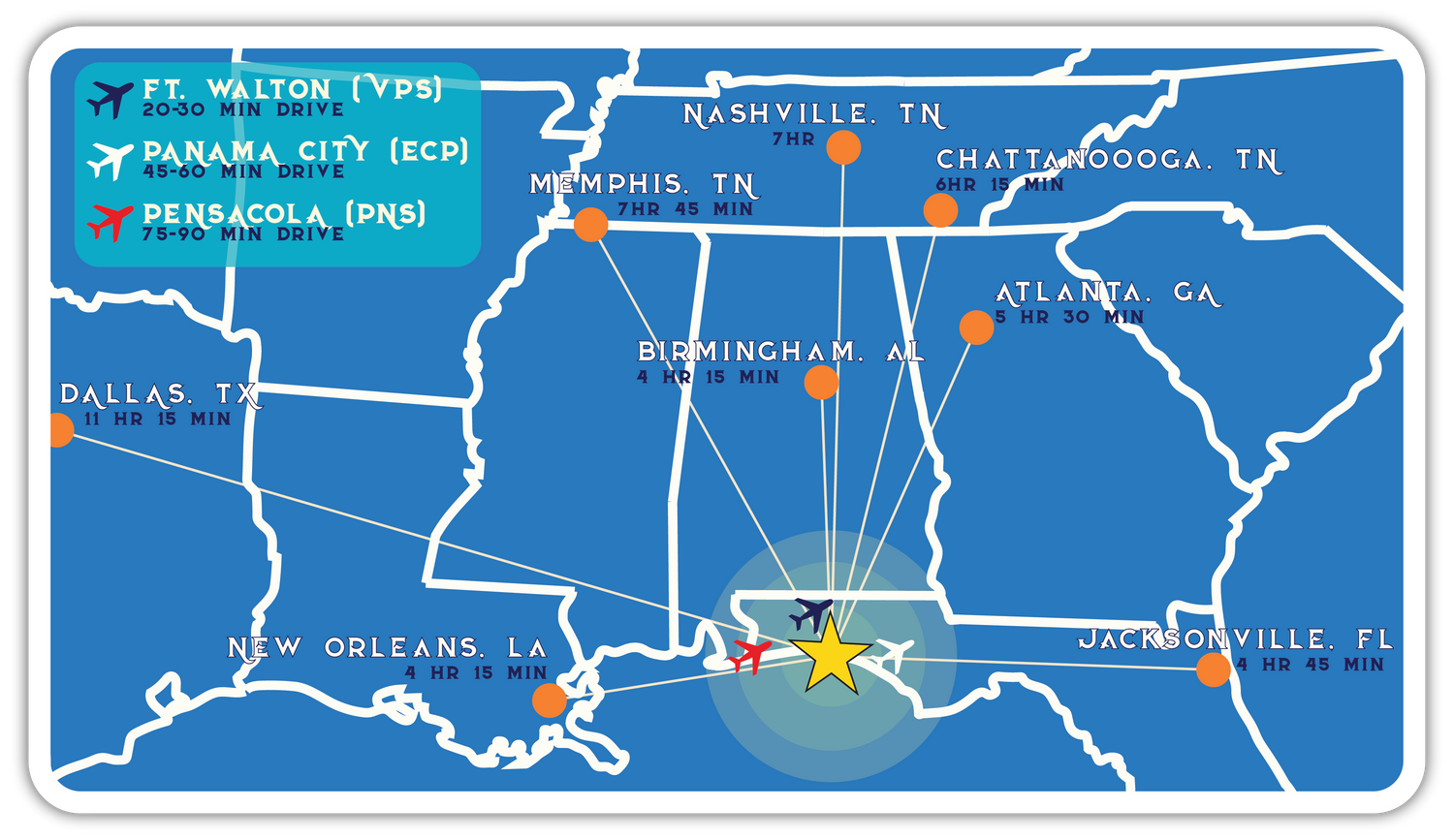 Easy drive from the Southeast, with three major airports within an hour! VPS (Destin/Ft. Walton) | PNS (Pensacola) | ECP (Panama City)